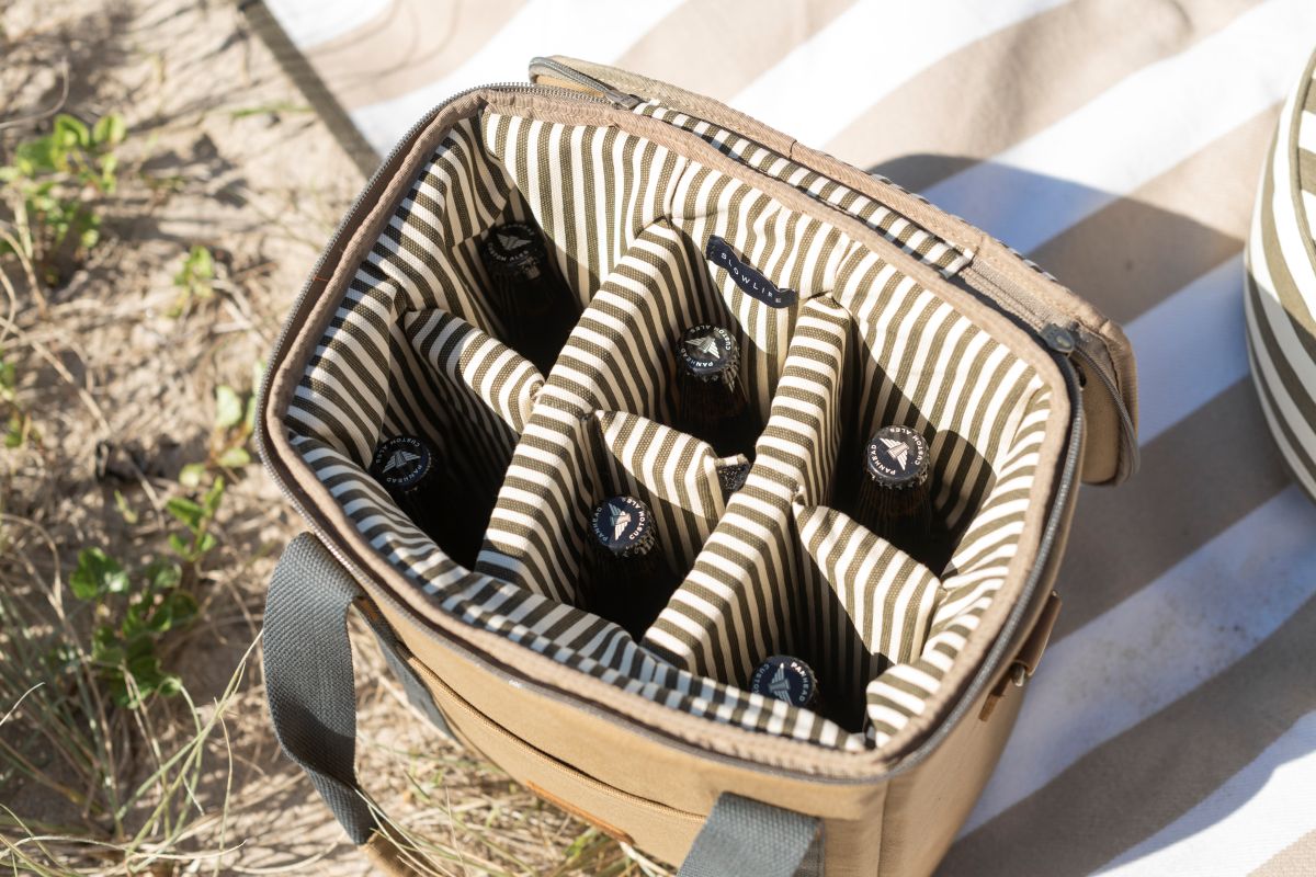 Like a bag, only cooler. This stylish satchel keeps up to 12 cans cold and refreshing for up to 24 hours, and is made to fit bottles of all sizes (including champagne bottles - woohoo!). With a flexible internal layout, the middle compartment can be fixed back to make more room for larger snacks or containers, allowing you to fill the bag however you please. Featuring a striped interior and leather details, and available in navy and olive.