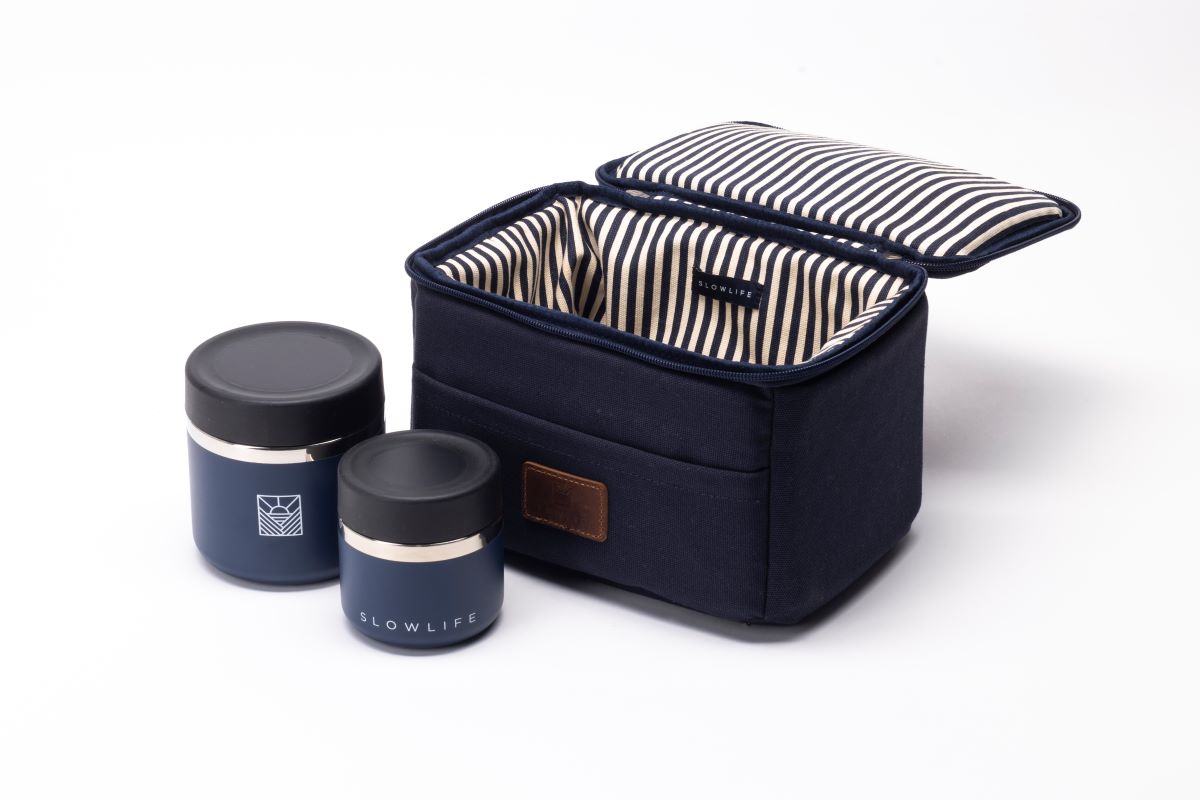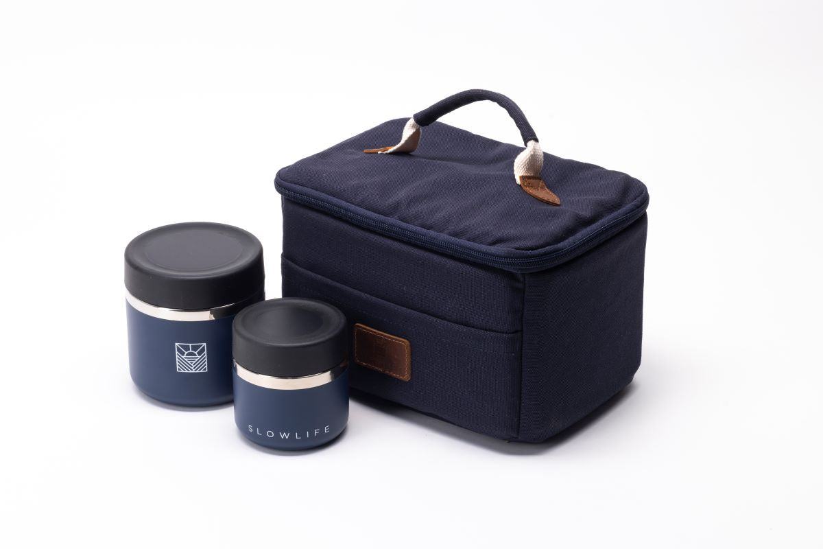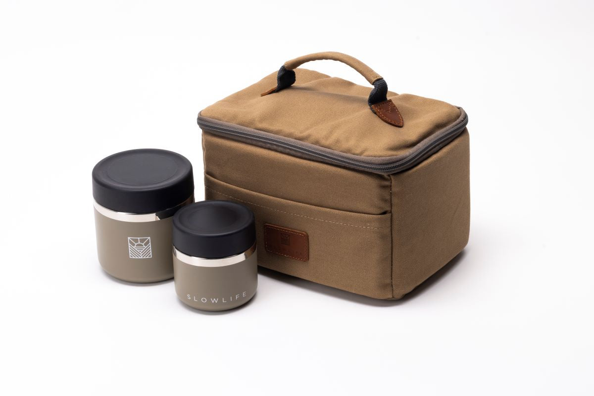 It includes our sturdy Lunch Bag, one 20oz Flask for your lunch on the go, and a smaller 8oz Flask for those extra snacks.